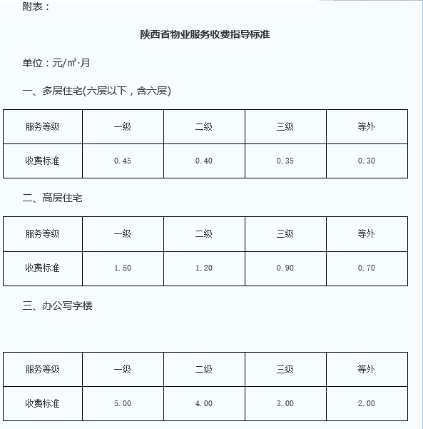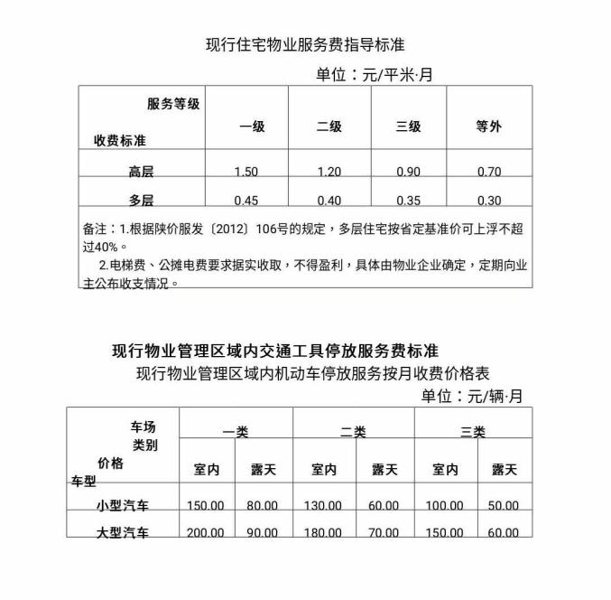 西安物业费收费标准示例